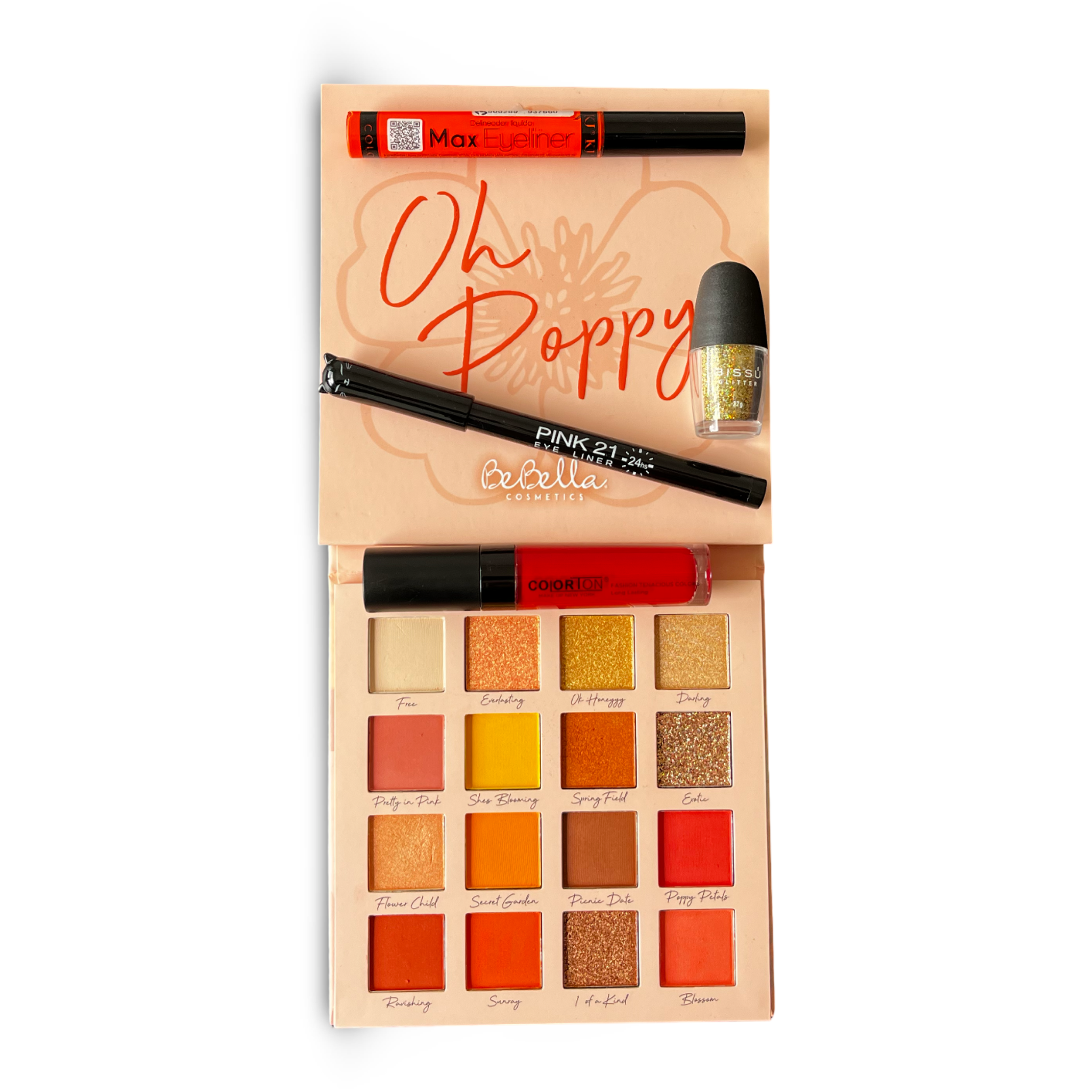 Incluye sombras encantadas, glitter sorpresa, delineador para crear ojo de gato, delineador neón y un gloss indeleble espectacular.